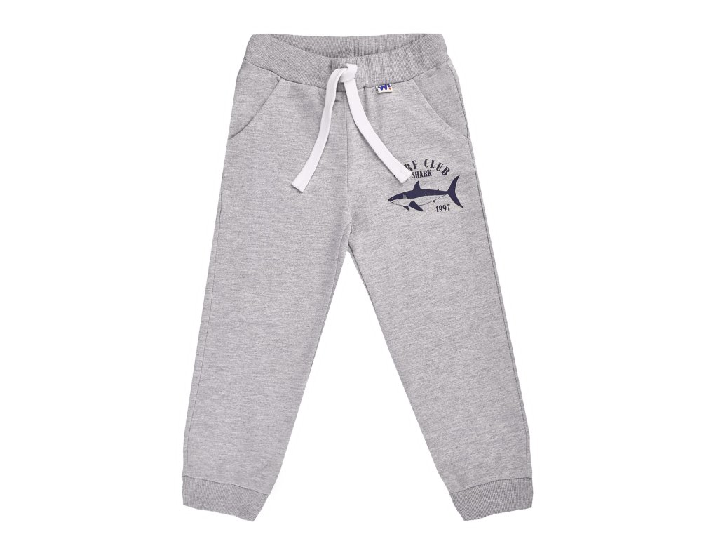 Chlapecké tepláky Surf Club v šedé barvě. V pase a na koncích nohavic jsou elastické manžety. V pase na zavazování. Po obou stranách tepláků jsou kapsy. Na levé straně u kapsy je znak Surf Club California se symbolem žraloka. Vyrobeno v Uzbekistánu. Materiál: 100% bavlna. Látka: Footer 250-260 gr. Návod k údržbě: Při praní se vždy řiďte pokyny uvedenými na štítku! Dostupné velikosti: 98 - 122. Barva: šedý melanž.Doplňkové parametry