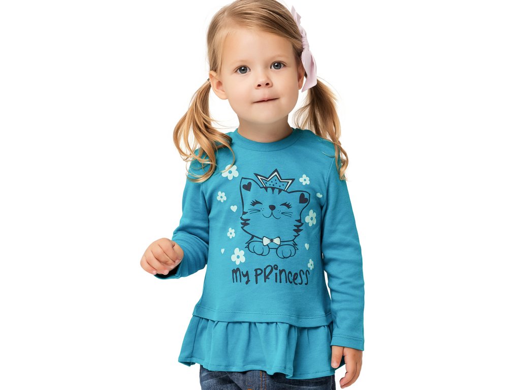 Dívčí tričko s dlouhým rukávem v tyrkysové barvě s kočičkou a nápisem My Princess. Zapínání na ramenním švu pro snadné oblékání. Velikosti 80 - 98. 100% bavlna. Vyrobeno v Uzbekistánu. Materiál: 100% bavlna. Látka: Interlock 180-190 gr. Návod k údržbě: Při praní se vždy řiďte pokyny uvedenými na štítku! Dostupné velikosti: 80 - 98. Barva: tyrkysová.