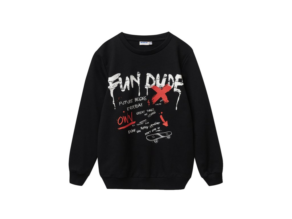 Chlapecká mikina Fun Dude z kolekce Lifestyle. Barva černá. Konce rukávů a spodní okraj s pružnými lemy. Velikosti 128 - 152. Kvalitní zpracování. Materiál 100% bavlna. Vyrobeno v Uzbekistánu. Materiál: 100% bavlna. Látka: Footer nečesaná teplákovina 250 - 260 g Návod k údržbě: Při praní se vždy řiďte pokyny uvedenými na štítku! Dostupné velikosti: 128 - 152. Barva: černá.Doplňkové parametry