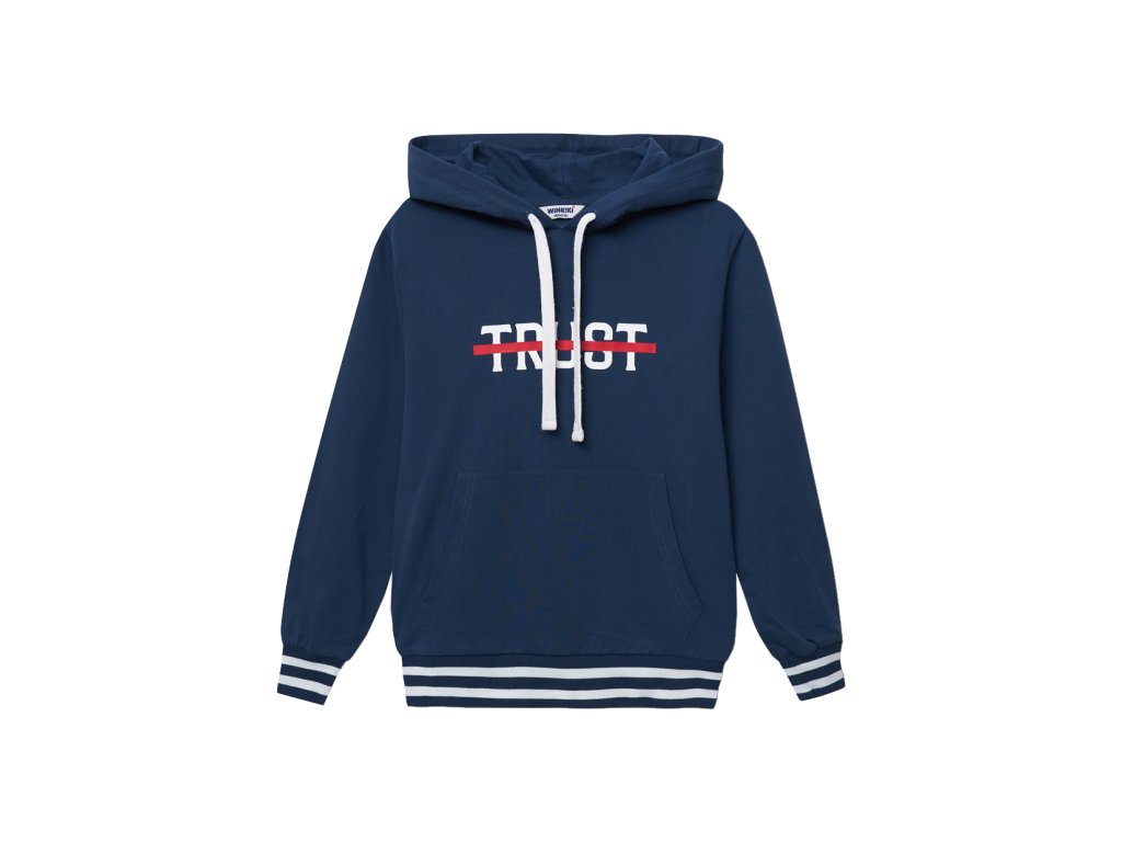 Chlapecká mikina Trust v tmavě modré barvě. Mikina s kapucí na zavazování a velkou klokaní kapsou na přední straně. Materiál: 100% bavlna. Velikosti: 128 - 170. Vyrobeno v Uzbekistánu. Materiál: 100% bavlna. Látka: Footer (nečesaná teplákovina) 250-260 g/m2 Návod k údržbě: Při praní se vždy řiďte pokyny uvedenými na štítku! Dostupné velikosti: 128 - 170. Barva: tmavě modrá.Doplňkové parametry