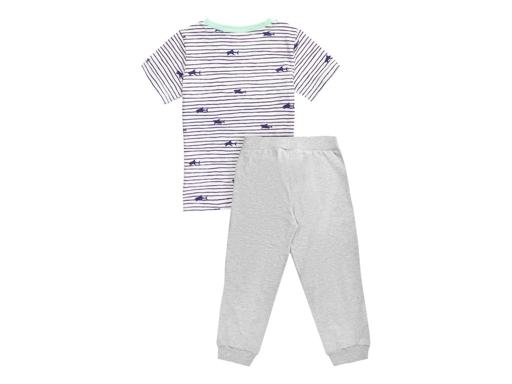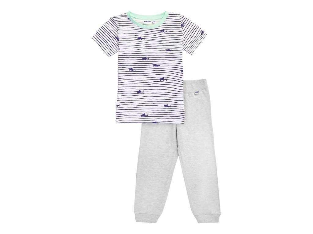 Chlapecké letní pyžamo Marine. Kalhoty v šedé barvě a tričko v bílé barvě s tmavě modrými proužky a malými žraloky. Kalhoty jsou v pase a na koncích nohavic do gumy. Příjemné pyžámko pro jarní a letní večery a noci plné dobrodružných snů. Vyrobeno v Uzbekistánu. Materiál: 100% bavlna. Látka: Supreme 150-160 gr. Návod k údržbě: Při praní se vždy řiďte pokyny uvedenými na štítku! Dostupné velikosti: 98 - 122. Barva: bílá/šedý melanž.