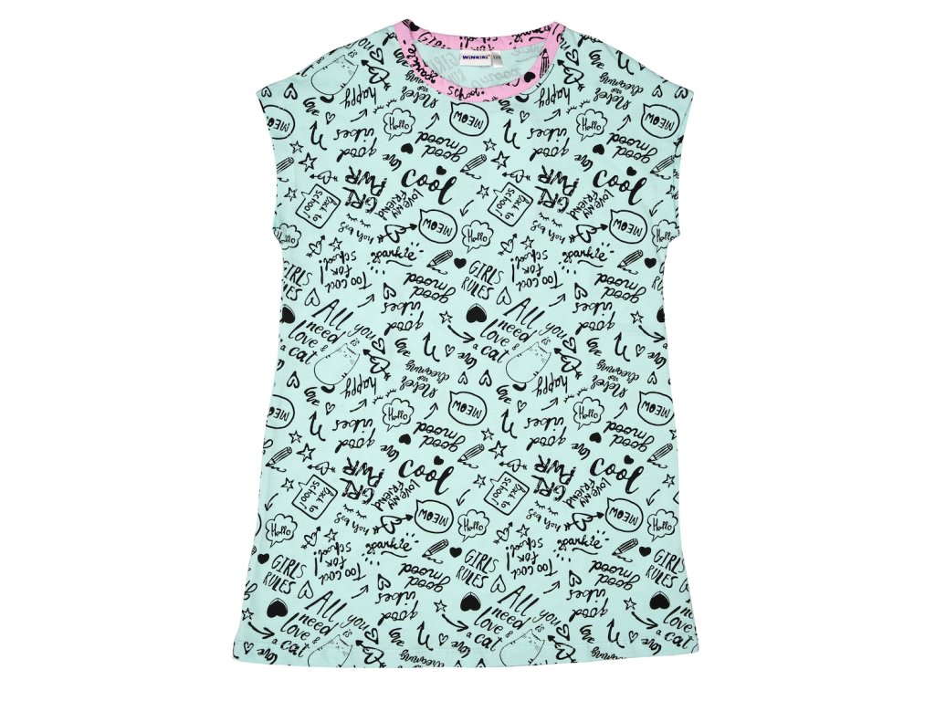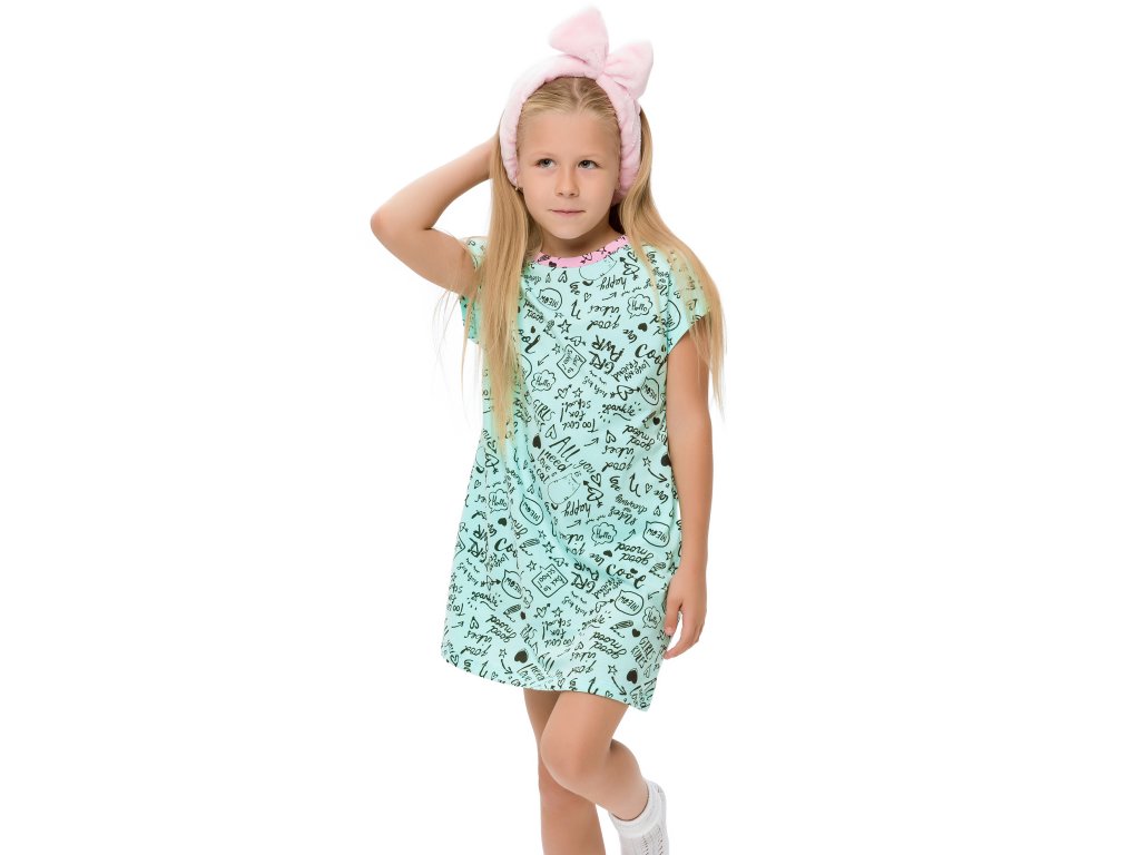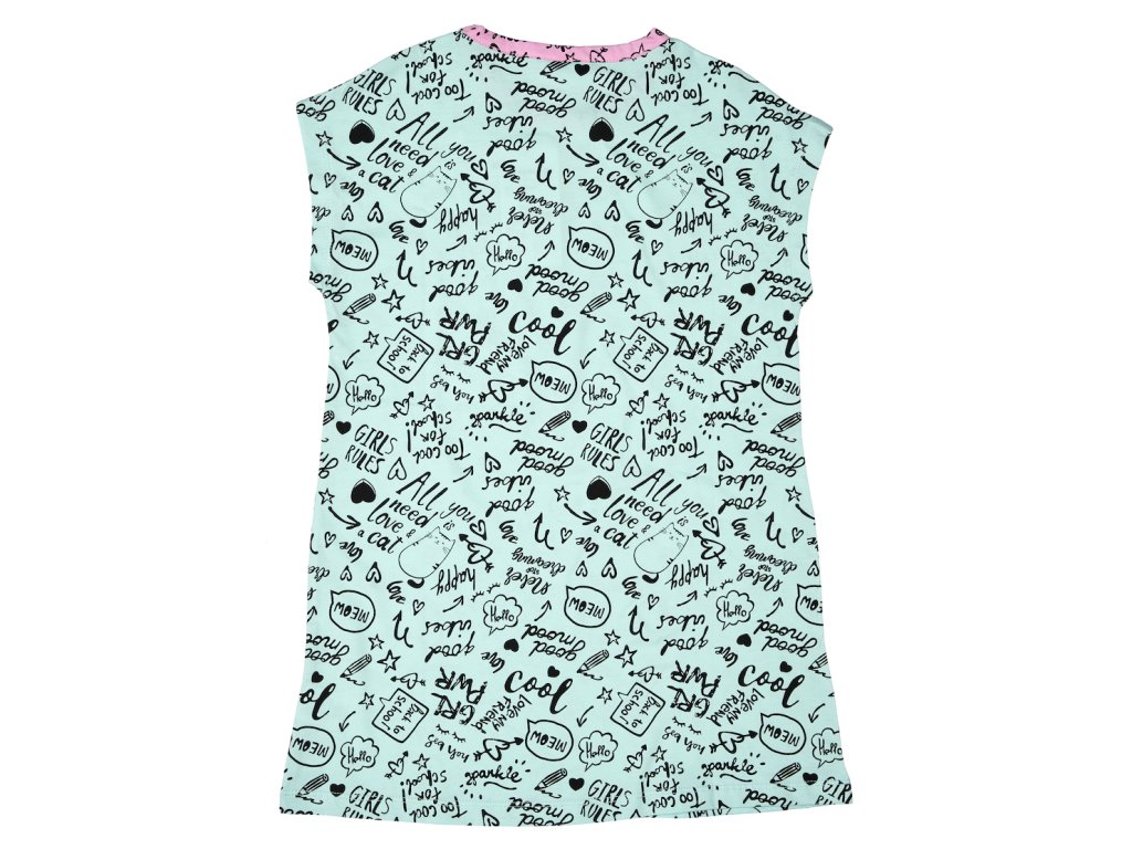 Dívčí noční košile Good Mood v mátové barvě s krátkým rukávem. Celá noční košile je potištěna pozitivními nápisy. Příjemný a lehký materiál. 100% bavlna. Velikosti 128 - 152. Vyrobeno v Uzbekistánu. Materiál: 100% bavlna. Látka: Supreme 150-160 gr. Návod k údržbě: Při praní se vždy řiďte pokyny uvedenými na štítku! Dostupné velikosti: 128 - 152. Barva: mátová.Doplňkové parametry