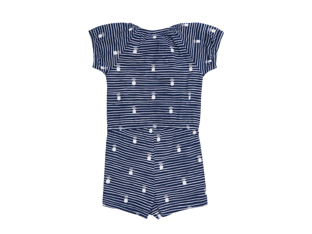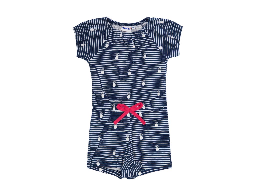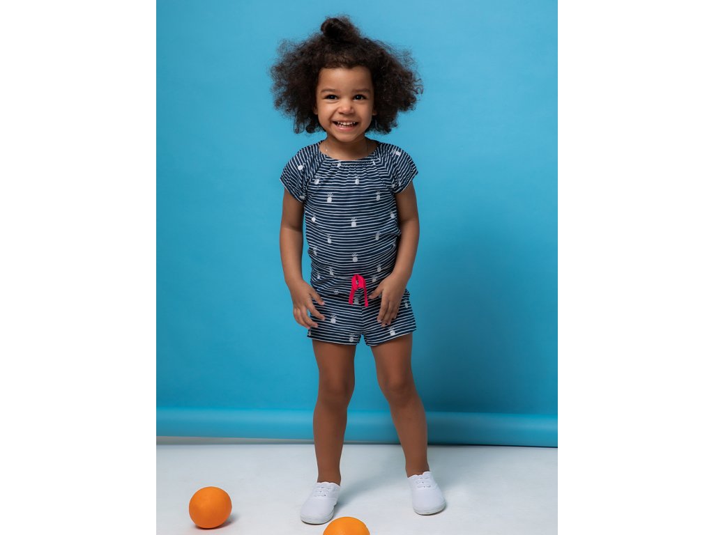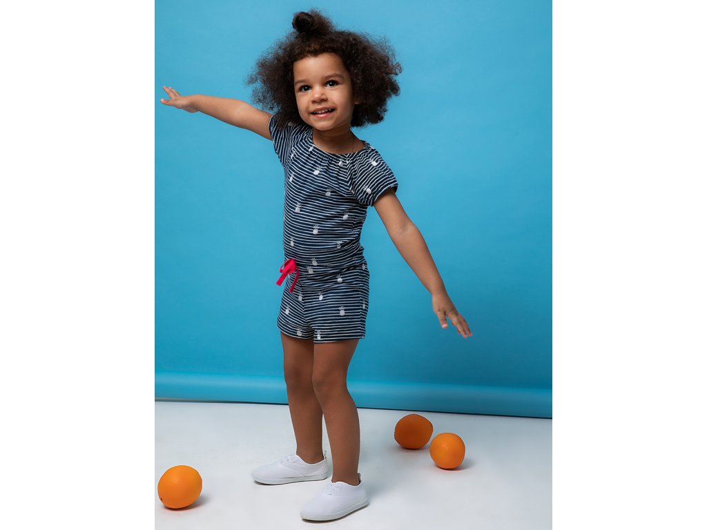 Dívčí overal Travel v tmavě modré barvě NAVY s jemnými bílými proužky a malými ananasy využijete při letních hrách venku nebo odpočinku doma. Horní část s krátkým rukávem a elastickým lemem kolem krku. V pase na zavazování a spodní část jso Vyrobeno v Uzbekistánu. Materiál: 92% bavlna, 8% elastan. Látka: Full lycra 160-170 gr. Návod k údržbě: Při praní se vždy řiďte pokyny uvedenými na štítku! Dostupné velikosti: 98 - 122. Barva: navy.Buďte první, kdo napíše příspěvek k této položce.