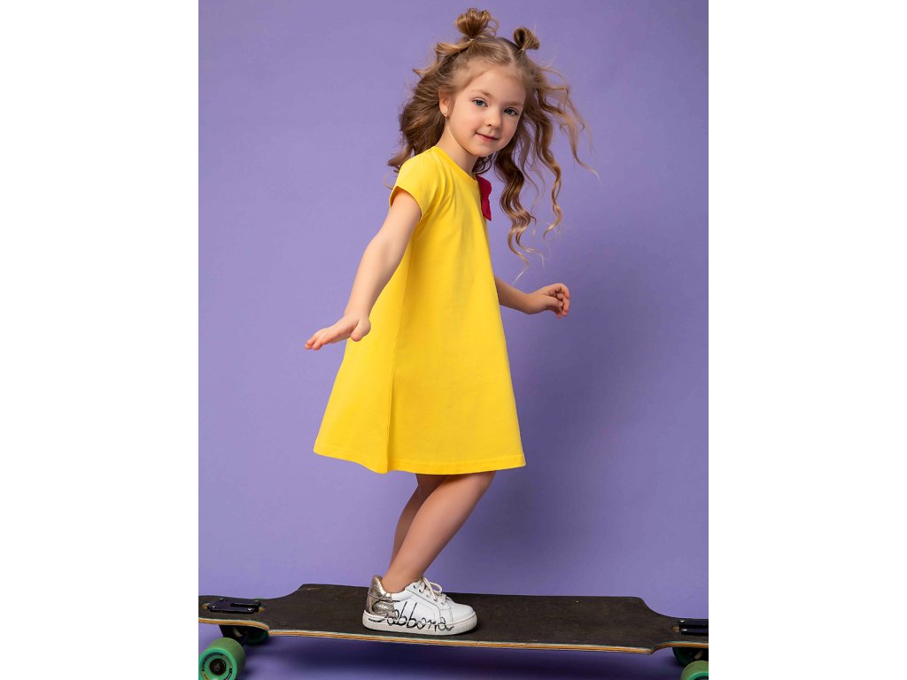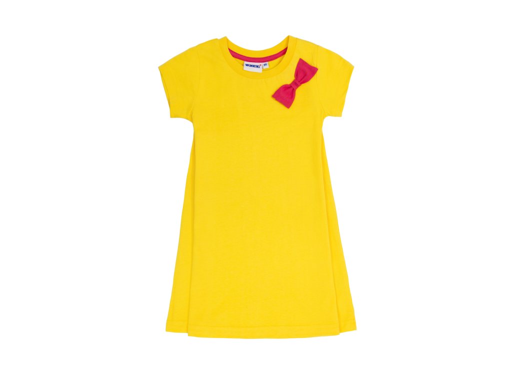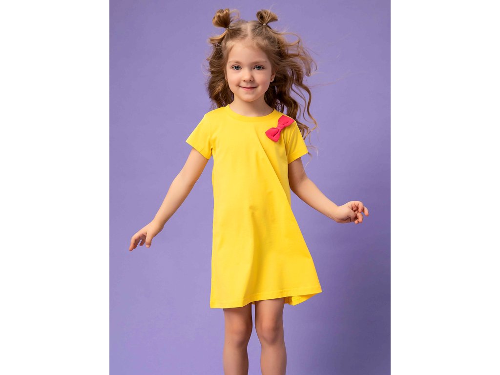 Dívčí šaty Basic. Jednoduché letní dívčí šaty s krátkým rukávem ve žluté barvě z kolekce Basic. Hezkým zpestřením je malá mašlička. Velmi příjemný materiál, který je vhodný na každodenní nošení. Kvalitní 100% bavlna. Velikosti: 98 - 122. Vyrobeno v Uzbekistánu. Materiál: 100% bavlna. Látka: Supreme 150-160 gr. Návod k údržbě: Při praní se vždy řiďte pokyny uvedenými na štítku! Dostupné velikosti: 98 - 122. Barva: žlutá.Doplňkové parametry