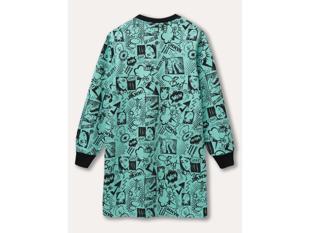 Dívčí šaty Comics z kolekce Comics. Barva tyrkysová. Délka šatů je nad kolena. V zimě krásně zahřejí. Na koncích rukávú a na spodní straně je pružný lem. Velikosti 140 - 164. Kvalitní zpracování. Materiál 100% bavlna. Vyrobeno v Uzbekistánu. Materiál: 100% bavlna. Látka: Footer nečesaná teplákovina 250 - 260 g. Návod k údržbě: Při praní se vždy řiďte pokyny uvedenými na štítku! Dostupné velikosti: 140 - 164. Barva: tyrkysová.Doplňkové parametry