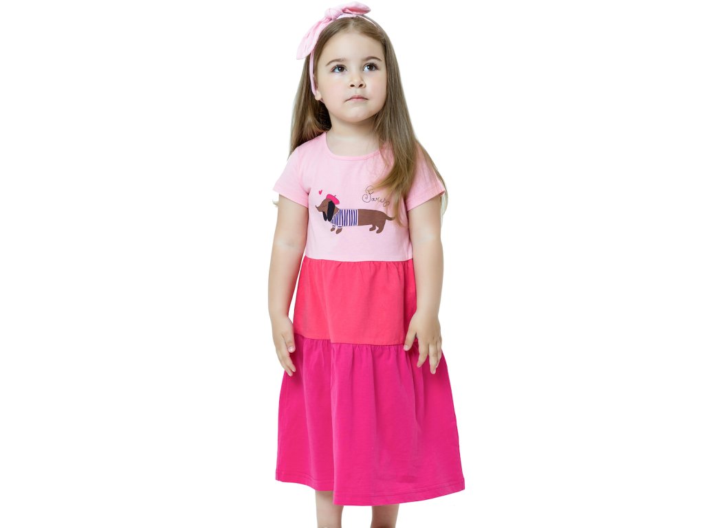 Dívčí šaty HUGO. Letní dívčí šaty Hugo s krátkým rukávem. Horní část je ve světle růžové barvě, v pase je růžová a sukýnka je v barvě fuchsia. Na přední je francouzský jezevčík Hugo a elegantní nápis Paris. Velmi příjemný materiál. Vyrobeno v Uzbekistánu. Materiál: 100% bavlna. Látka: Supreme 150-160 g. Návod k údržbě: Při praní se vždy řiďte pokyny uvedenými na štítku! Dostupné velikosti: 98 - 122. Barva: růžová/fuchsie.