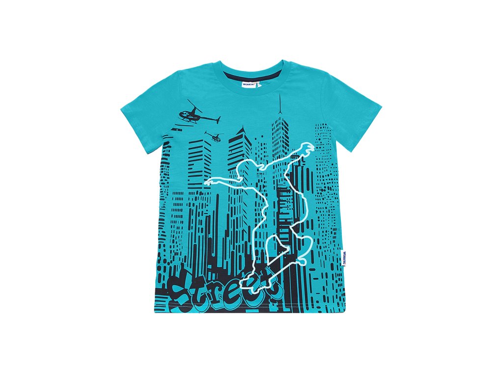 Chlapecké tričko Street s krátkým rukávem v tyrkysové barvě. Na přední straně je silueta velkoměsta se skateboardistou. Příjemný a lehký materiál - 100% bavlna. Velikosti 128 - 152.