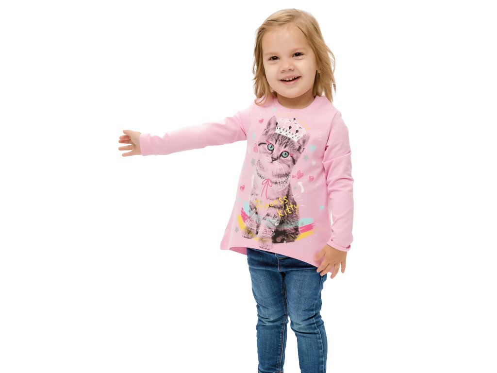 Dívčí tričko Princess Cat s dlouhými rukávy v růžové barvě. Na přední straně kočička s korunkou. Příjemný a pružný materiál. 95% bavlna a 5% elastan. Velikosti 98 - 122.