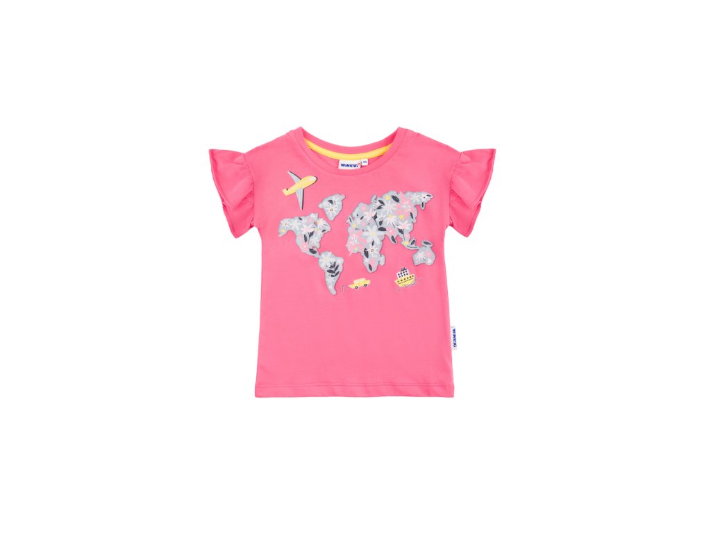 Lehké dívčí tričko World s krátkým rukávem v růžové barvě se zobrazením světadílů na přední straně. Přímo vybízí k cestování. Tričko z kolekce Travel. Na koncích rukávů malé elegantní volány. Lehký a příjemný materiál - 100% bavlna. Velikos Vyrobeno v Uzbekistánu. Materiál: 100% bavlna. Látka: Supreme 150-160 gr. Návod k údržbě: Při praní se vždy řiďte pokyny uvedenými na štítku! Dostupné velikosti: 98 - 122. Barva: růžová.Doplňkové parametry