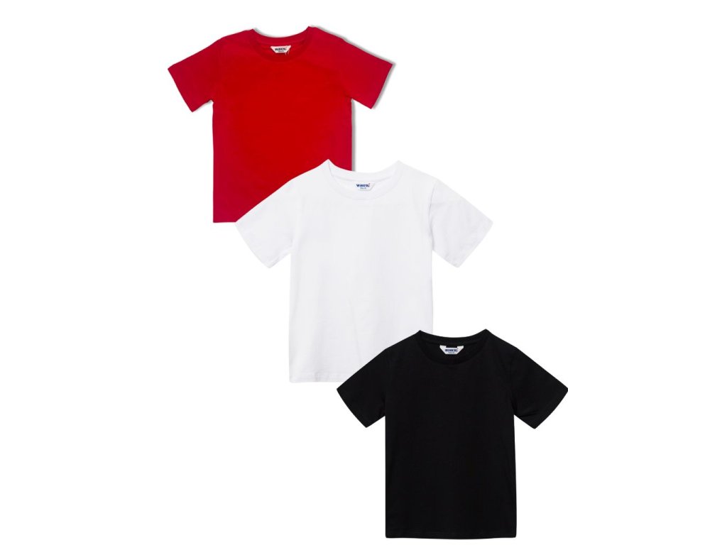 Set triček s krátkým rukávem v barvách bíla, červená a černá potěší chlapce i dívky. Patří do každého šatníku. Materiál: 100% bavlna. Velikosti: 128 - 170. Vyrobeno v Uzbekistánu. Materiál:100% bavlna. Látka: Lycra 180 - 200 g. Návod k údržbě: Při praní se vždy řiďte pokyny uvedenými na štítku! Dostupné velikosti: 128 - 170. Barva: více barev.